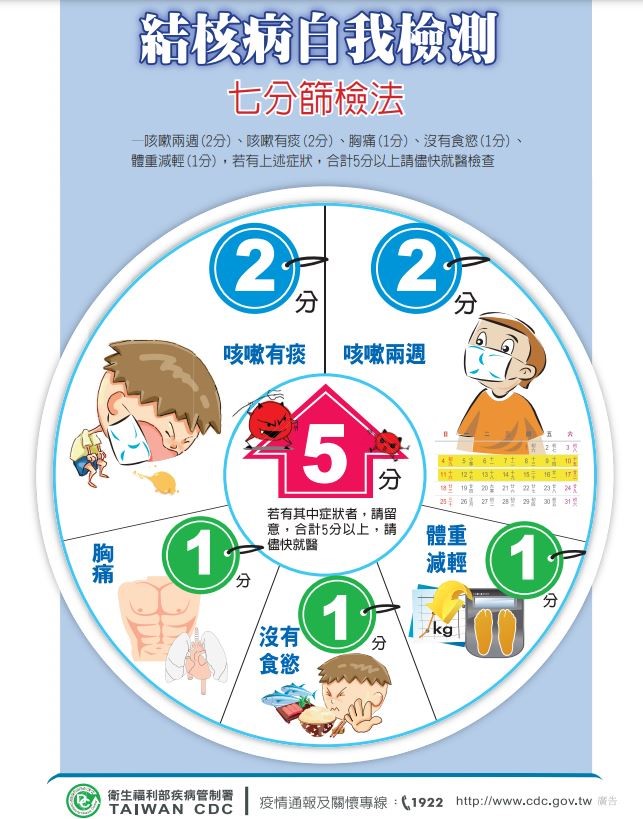 - 留意結核病的可能症狀,七分篩檢法自我檢測如圖示。合計5分以上請儘快就醫。